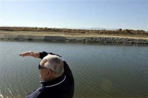 Dennis Freeman, who oversees a primary canal that irrigates the valley's farm fields, surveys buckling caused by subsiding land due to to many wells tapping the underground water in Dos Palos, Calif., Thursday Nov. 19, 2009. 'There's no doubt about it, the canal is sinking,' Freeman said, gesturing at cracked and buckled concrete panels lining the structures edge. 'There's more wells going in, because our growers gotta get water to their crops. But we're always concerned about the effect that will have.' (AP Photo/Russel A. Daniels)