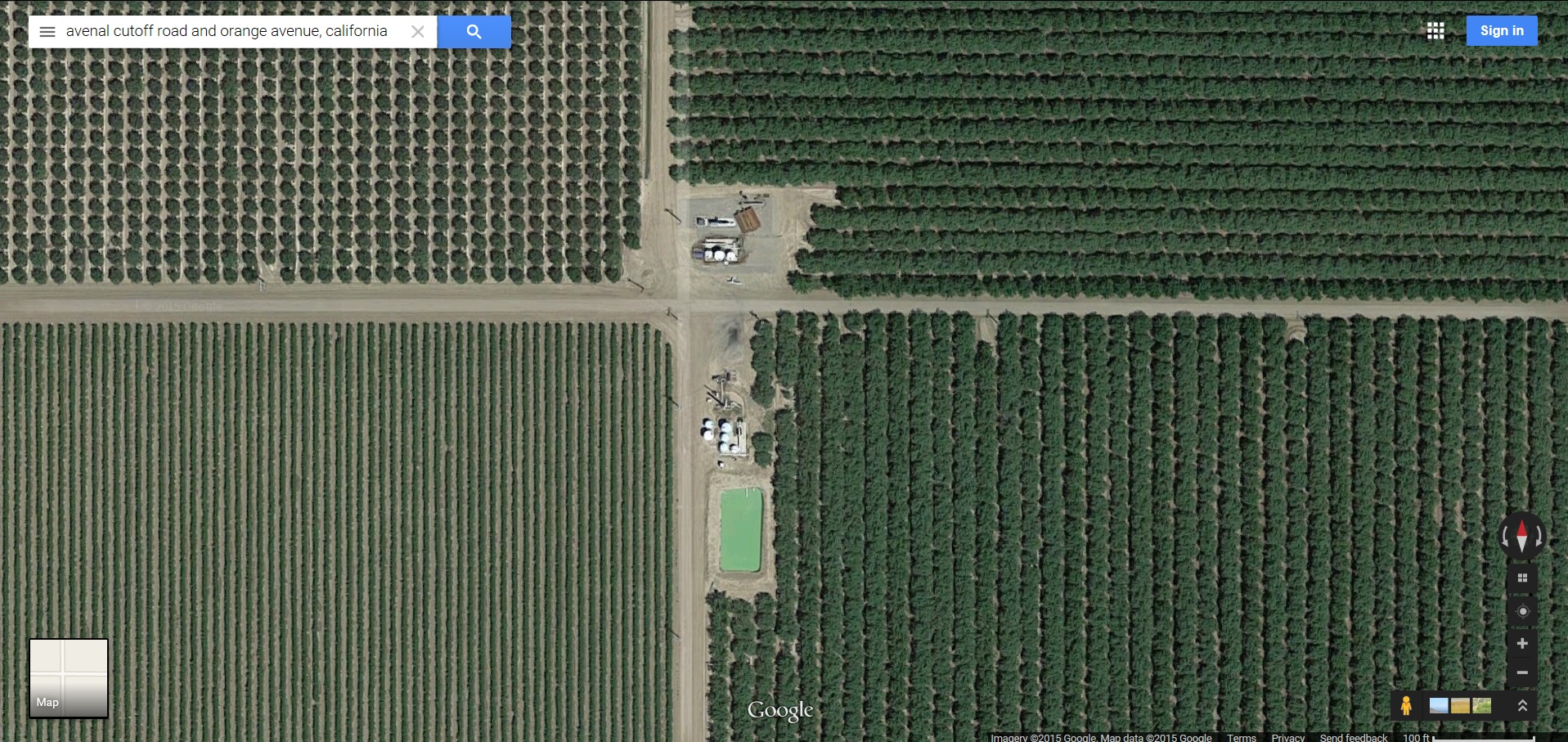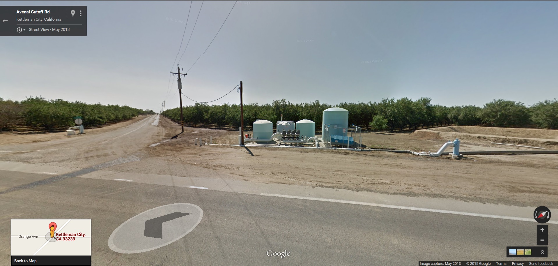 There isn’t a street view of the intersection of Orange Ave and unnamed road. But a half mile away, at Orange Ave and Avenal Cut-off Road, there are two more wells inside the subsidence bowl. The street view catches those neatly. Here they are on both sides of the street.